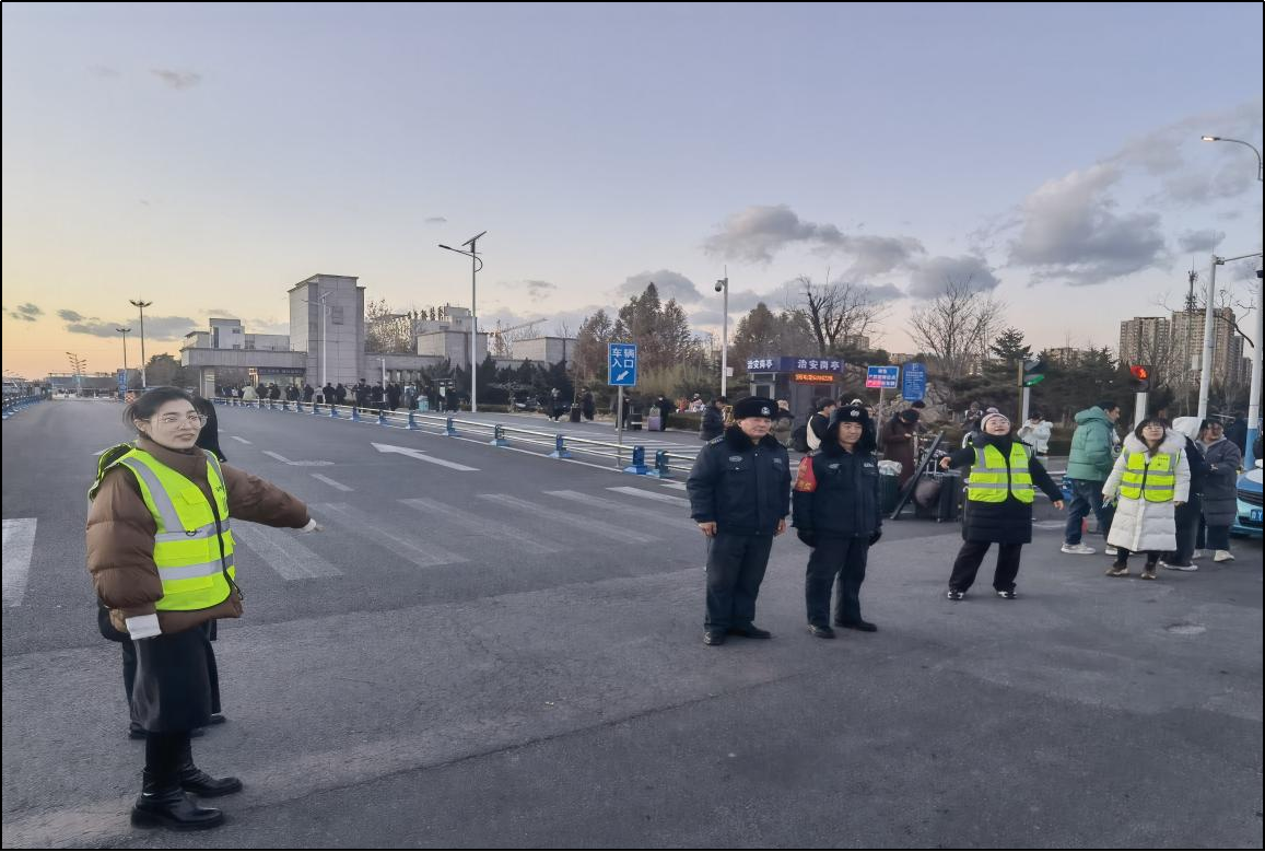 护航返乡,疏导交通“有力度”。正值返乡高峰,学校附近路段交通压力骤增,党员们积极作为,坚守在自己的志愿岗位上,耐心引导车辆分流,有效缓解了校门口的拥堵状况。引导接送学生车辆规范停放,护航学子安全上车,平安回家。现场,党员们在疏导交通的同时,还为学生发送暖心提醒,“注意安全”、“雪天路滑”“行李看管好”……一句句细心叮嘱,温暖了学生的心,让回家的路途不再寒冷。党员们的身影在风雪中显得格外坚定,他们用实际行动诠释了“黄马甲”的温度与力量。