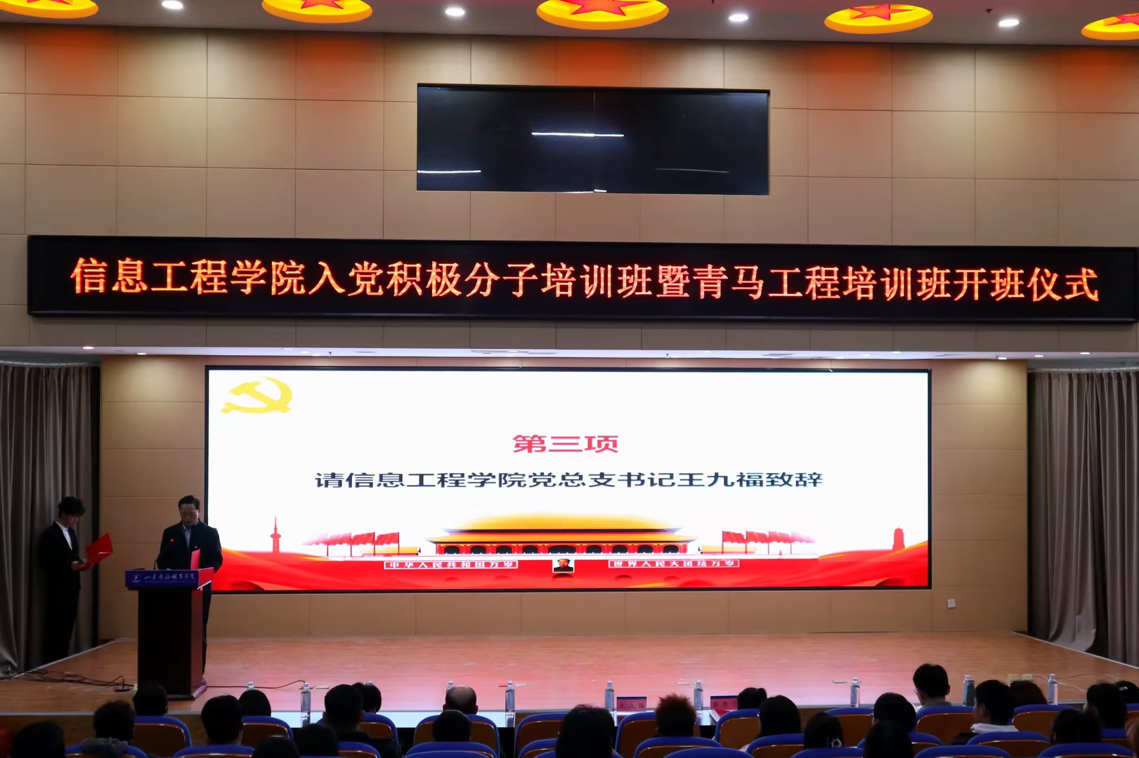 开班仪式在嘹亮的国歌声中拉开序幕,信息工程学院党总支书记王九福作动员讲话,他对参训学员向党组织靠拢的积极性表示了肯定,并提出三点要求:一是要正确认识参加入党积极分子暨“青马工程”培训的重要意义。二是培养高尚品行,夯实人生根基。三是发挥先锋模范作用,积极挺膺担当。大家要带头遵守法律法规和校纪校规,时时处处以身作则。让青春在服务人民、奉献社会中焕发出更加绚丽的光彩,用职教力量奋力谱写新时代新征程上新青年的青春力量。