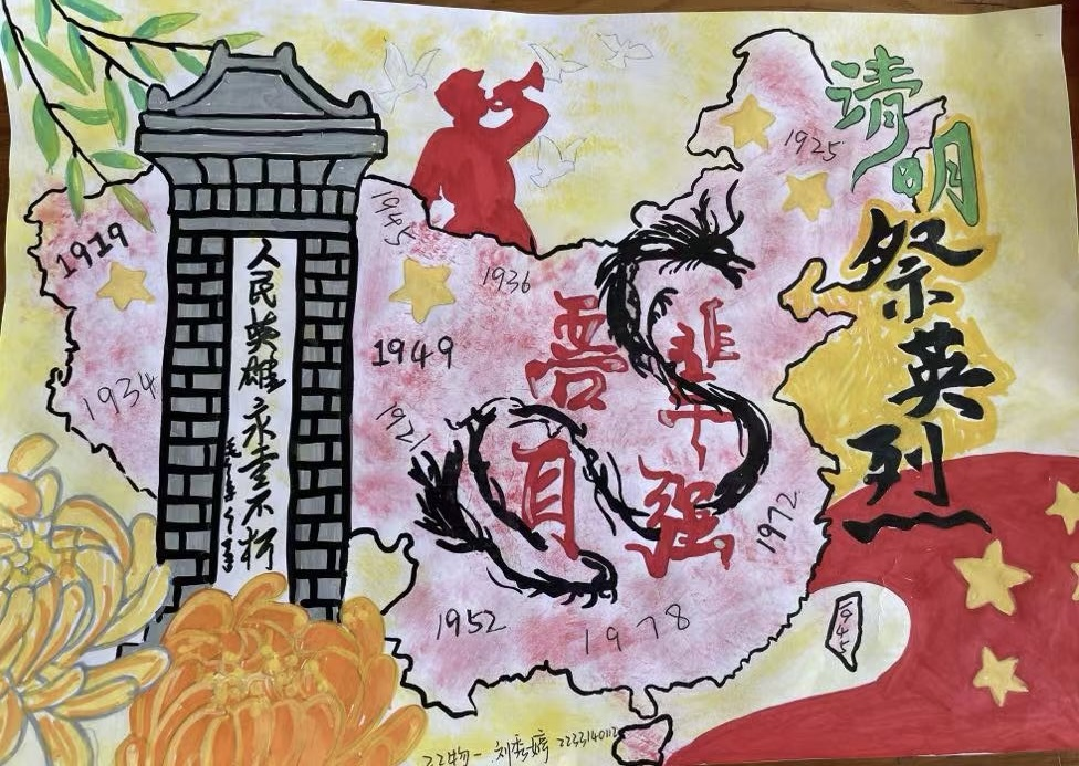通过学院红色宣讲的引导,清明假期经管学子们自行组织前往家乡的红色旅游景区、革命纪念园和烈士陵园,表达对革命先烈的无限追思与崇高敬意,激励自我,并根据感想手绘出海报,海报上生动展现出清明节的传统习俗与革命先辈们的丰功伟绩。
