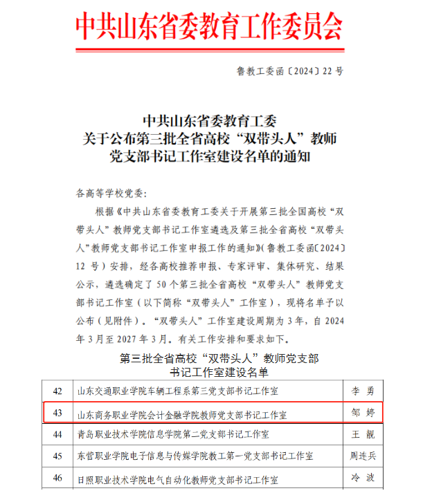 近日,山东省委教育工委公布了第三批全省高校“双带头人”教师党支部书记工作室建设单位名单,会计金融学院教师党支部书记工作室成功获批立项。这是我校首次入选全省高校“双带头人”教师党支部书记工作室建设单位,也是党建引领学校事业高质量发展的又一重要成果。