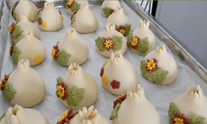 活动在轻松愉快的氛围中顺利进行。“老师,为什么我揉的面团不光滑?”、“为什么我做的小燕子的头看起来有点大?”。同学们积极地向老师请教,老师耐心细致地讲解并手把手的传授技巧。在老师的指导下,同学们利用各种颜色的面团,采用揉、捏、揪、压、搓等手法,制作出了石榴、燕子、玫瑰花等形态各异、栩栩如生的花饽饽。经过一个多小时的醒发和蒸制,热气腾腾的花饽饽出炉了,同学们品尝着自己的劳动成果,脸上洋溢着自豪和快乐。通过亲手参与制作,同学们了解了胶东花饽饽承载的文化底蕴,感知到了劳动人民的智慧和创造力。