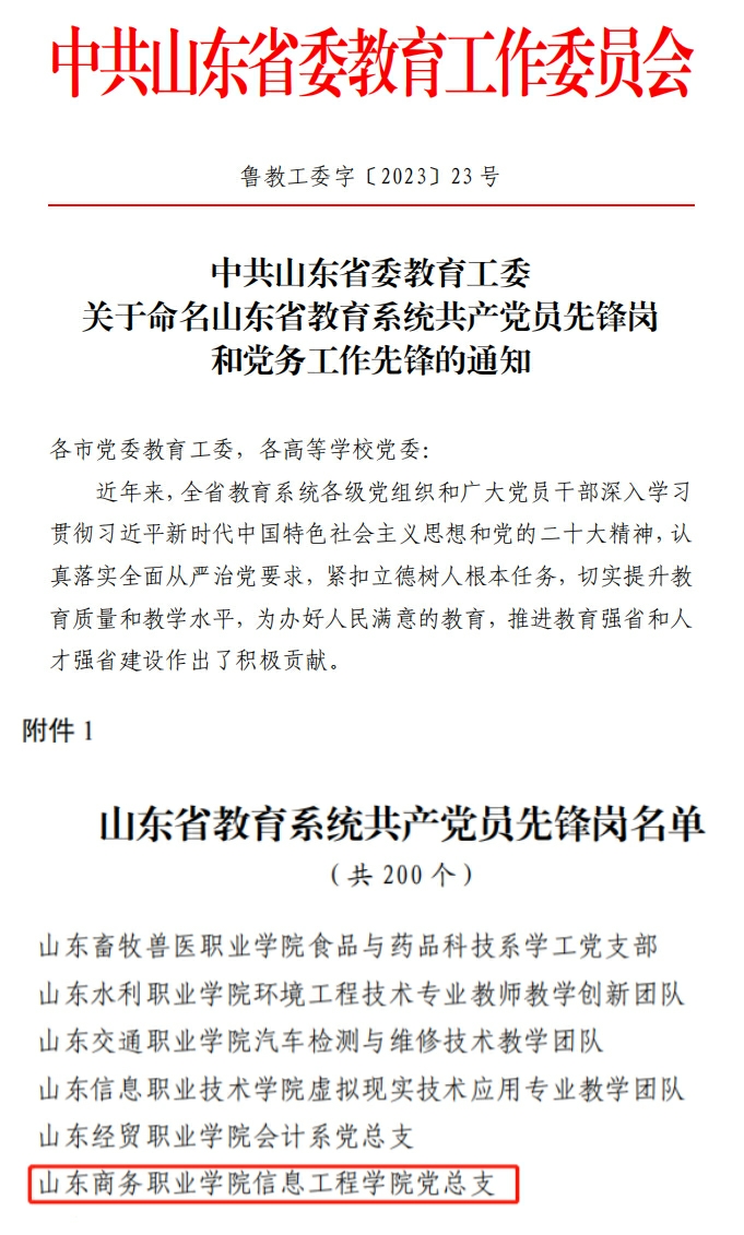 近日,中共山东省委教育工委印发《中共山东省委教育工委关于命名山东省教育系统共产党员先锋岗和党务工作先锋的通知》(鲁教工委字〔2023〕23号),我校信息工程学院党总支荣获“山东省教育系统共产党员先锋岗”命名。