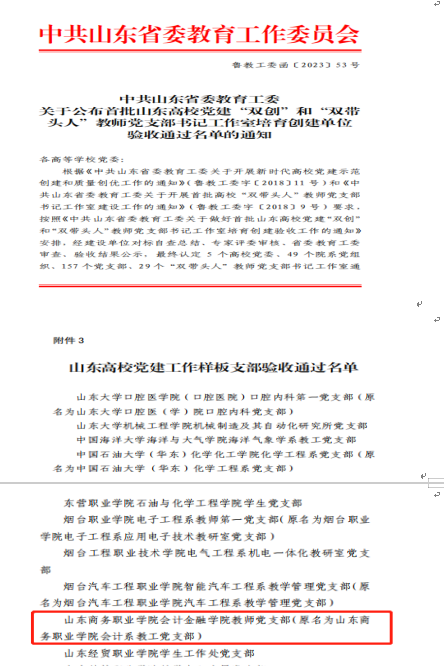 近日,山东省委教育工委公布首批山东高校党建“双创”和“双带头人”教师党支部书记工作室培育创建单位验收通过名单,山东商务职业学院会计金融学院教师党支部通过山东高校党建工作样板支部验收。