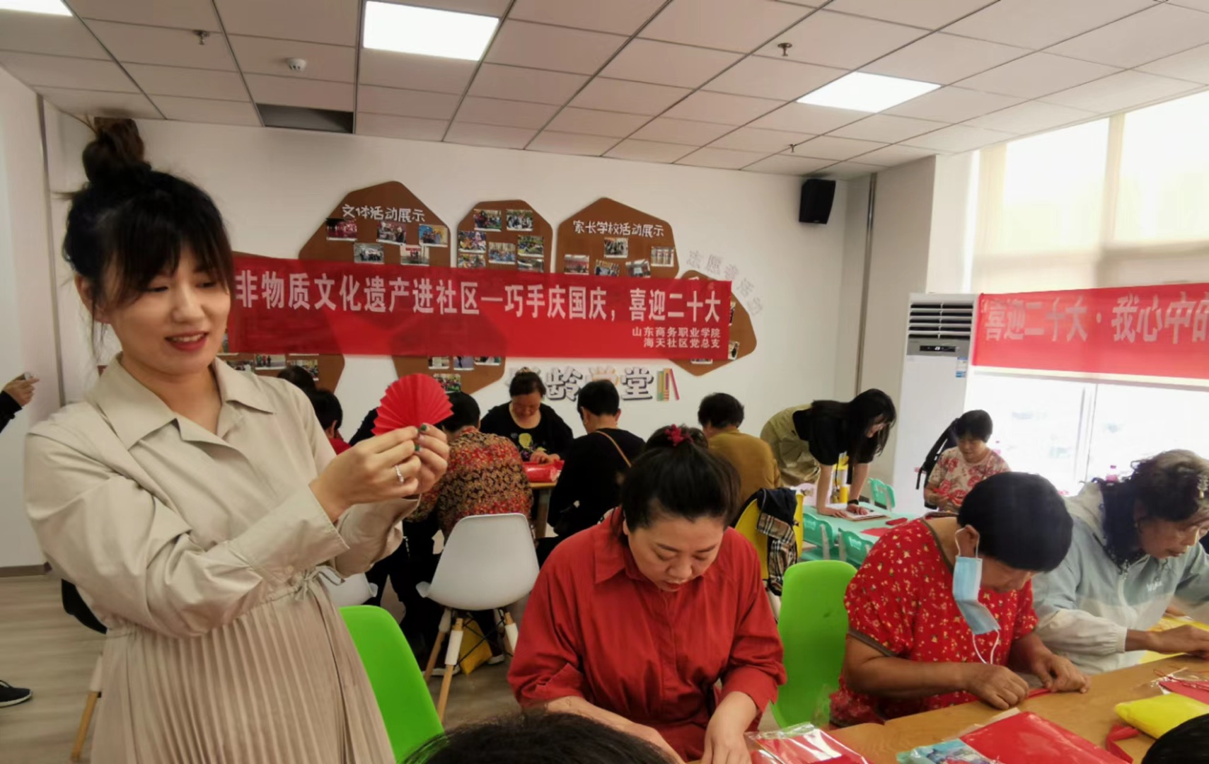 为弘扬传统文化,厚植爱国爱党情,喜迎党的二十大胜利召开,扎实推进“双报到”工作走深走实,丰富社区居民生活。近日,山东商务职业学院会计金融学院、文化旅游学院联合马山街道海天社区党总支开展“非物质文化遗产进社区——巧手庆国庆,喜迎二十大”主题活动。
