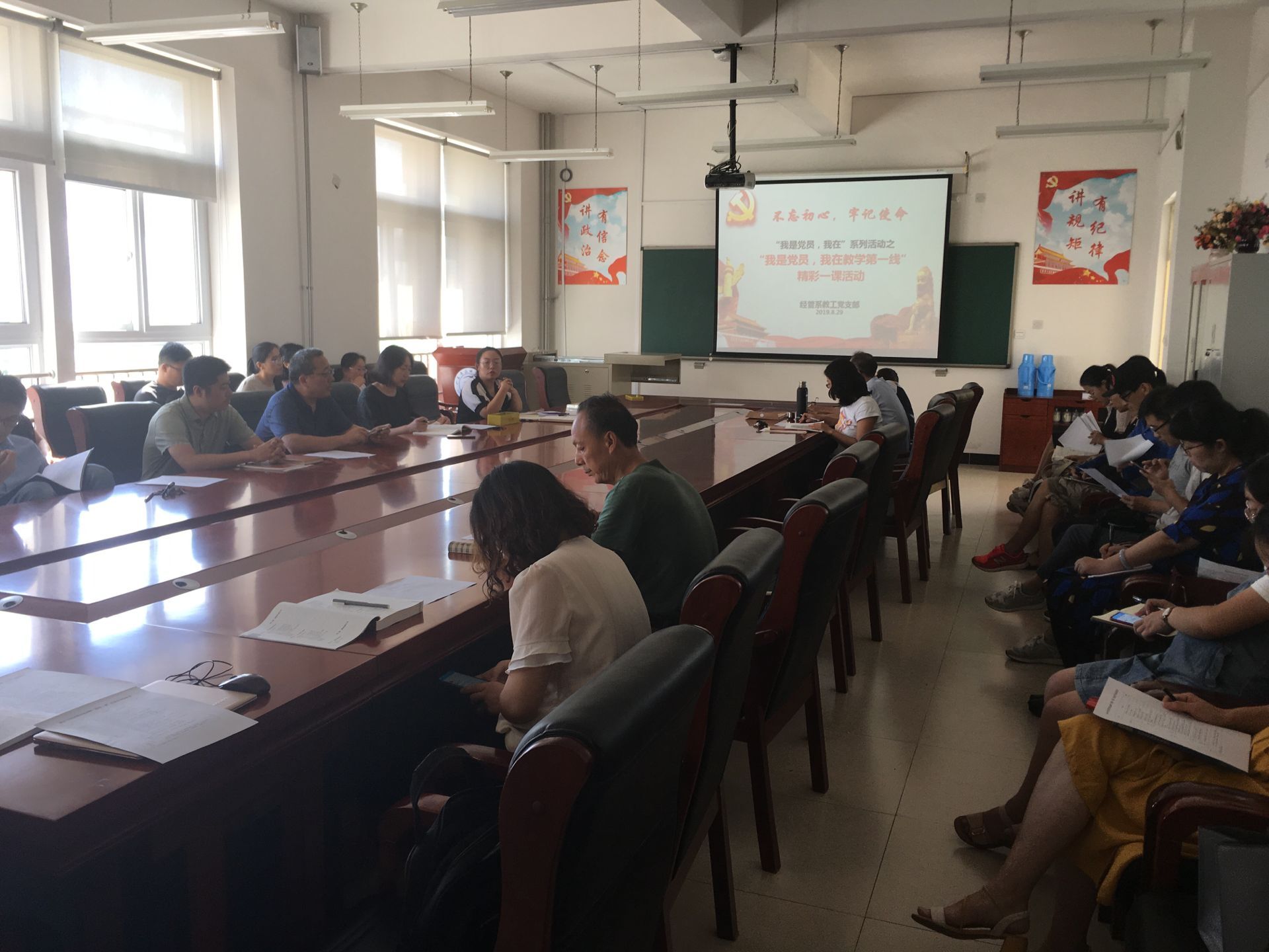 本次主题党日活动分为两个阶段,首先全体党员以党小组会的形式集中学习了习近平总书记在“不忘初心、牢记使命”主题教育工作会议上的重要讲话精神。随后,支部全体党员集体来到3A311开展了别开生面的“我是党员,我在教学第一线”精彩一课活动,以实际行动践行“不忘初心,牢记使命”。党员老师们在三尺讲台上各显神通,大展风采,充分彰显了经济管理系教师深厚的专业知识和扎实的教学基本功,整个活动在专业、奋进、轻松的氛围中进行,以教师间教学能力的切磋、交流学习,达到提升系部整体教学水平的目的。同时,也促进了党员教师围绕业务抓党建,抓好党建促业务,将党建工作与业务工作紧紧的结合到了一起。