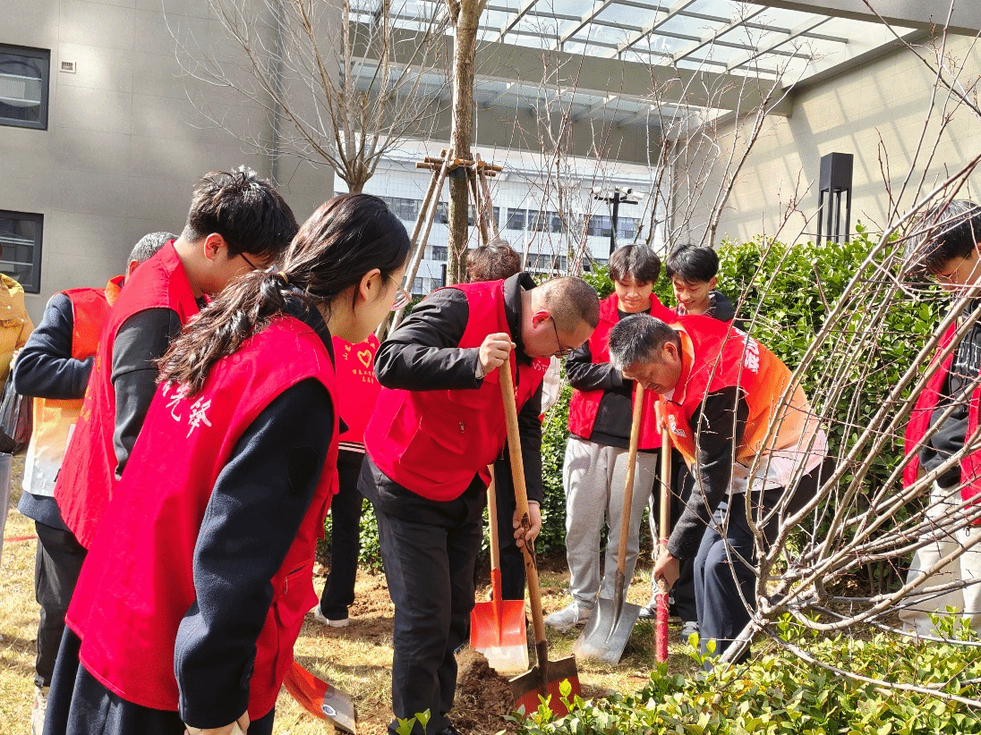 活动现场,身着红色马甲的党员们分为三组,分工协作、默契配合。挥锹铲土、扶苗围堰、提水浇灌……每道工序都一丝不苟。学生志愿者郑金燕表示:“作为新时代青年,我们既要做雷锋精神的传承者,也要当生态文明的建设者,这次活动让我深刻体会到‘功成不必在我,功成必定有我’的责任担当。”