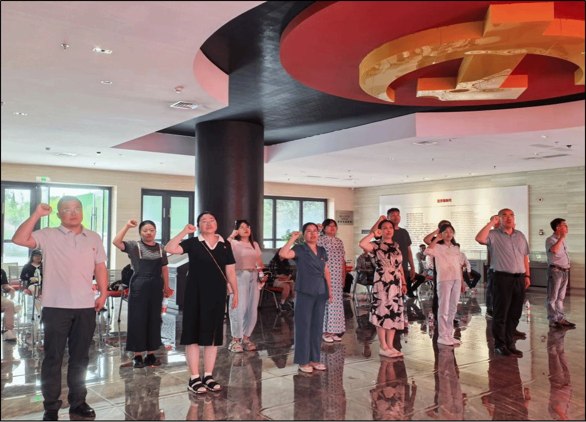 在陈列馆的鲜红党旗前,全体党员高举右拳,以铿锵有力的声音重温入党誓词。一字一句的誓言,不仅是对入党初心的回顾,更彰显着党员们对党的无限忠诚和为党的事业奋斗终身的坚定决心。