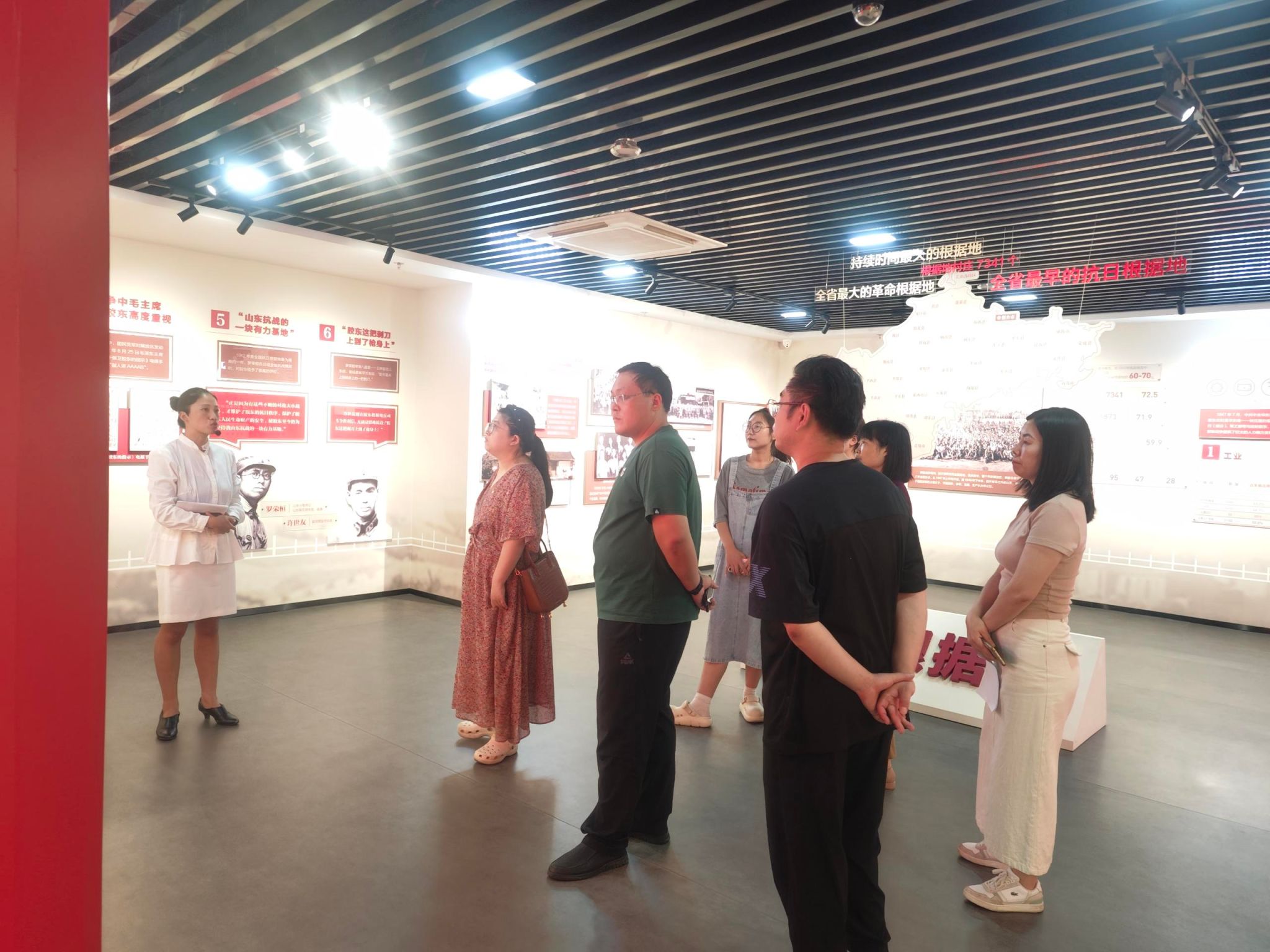 “光荣传统——胶东根据地工运陈列馆”是全国首个以中国共产党领导的敌后抗日根据地和解放区工人运动为主题的展馆。活动中,大家观摩了“英雄的胶东和胶东工人”“兵工奇迹”“众志成城”“翻身解放”“时代传承”五大展区,通过雕塑、绘画、场景还原、互动体验等方式,全面展示了抗日战争和解放战争时期,胶东工人在根据地建设中作出的突出贡献。一张张图片、一件件事迹,勾勒出胶东工人在中国共产党领导下,众志成城、勇立潮头、建功立业的光辉历程,展现出敢于担当、勇于拼搏、勤于奉献的实干精神。