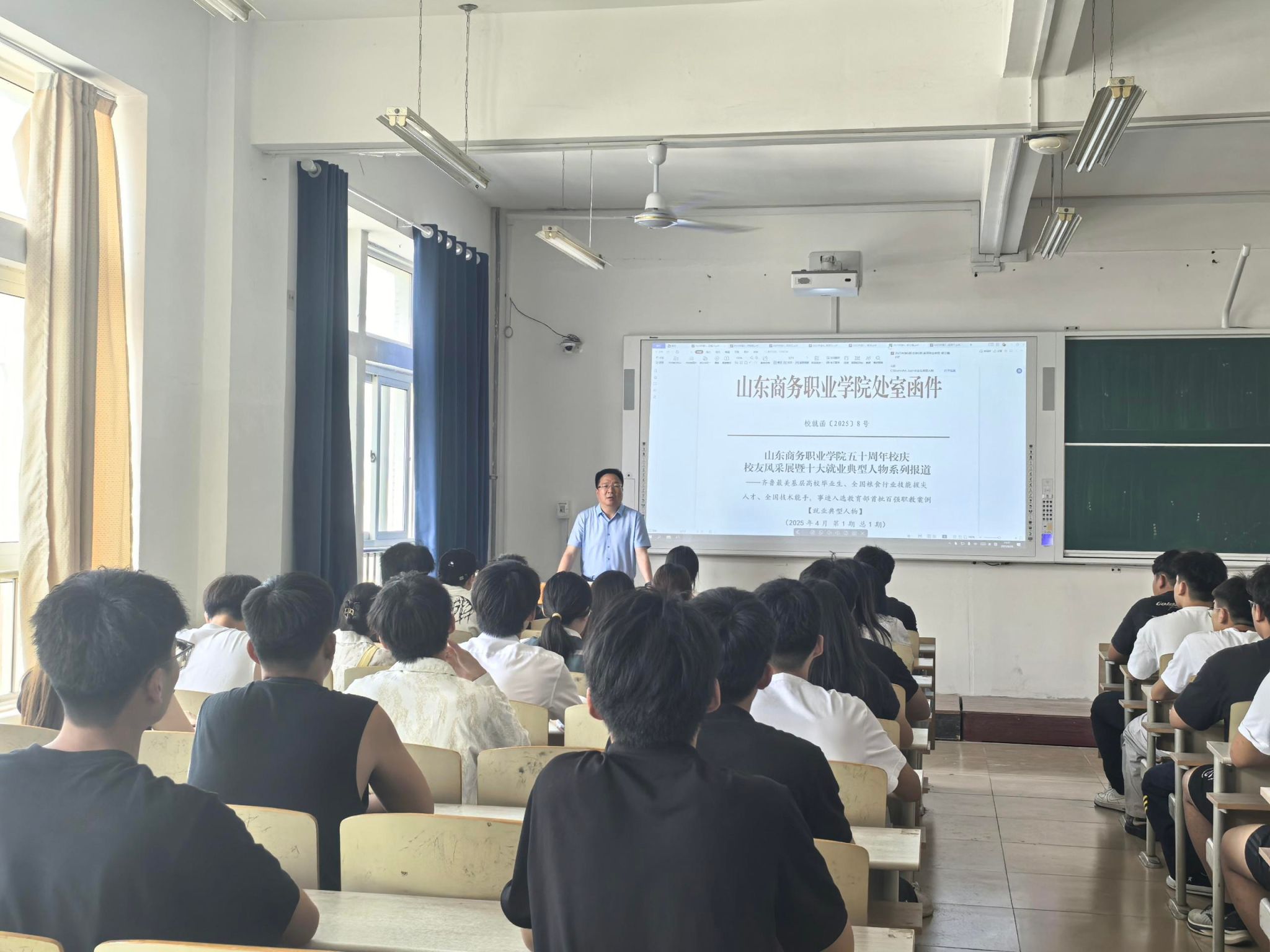 课堂上,张越以山东商务职业学院五十载发展历程为主线,为同学们深情讲述了学校从1975年建校初期“白手起家、艰苦创业”的奋斗岁月,到如今发展成为山东省特色鲜明的高职院校的辉煌历程。从当年几十人的小规模办学,到如今万名学子的现代化校园,每一步发展都凝聚着商务职院人的智慧与汗水。