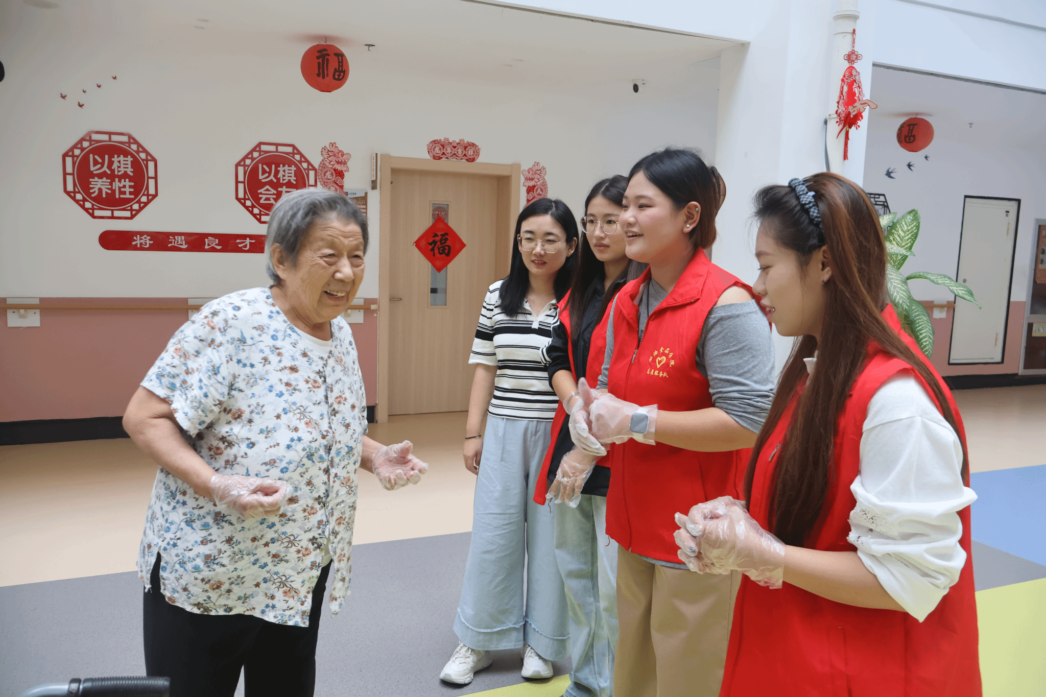 随后,师生党员与志愿者走进山东健康颐养中心开展实践活动。银发长者与青春学子共同用歌声表达对党的忠诚与对祖国的热爱,合唱《没有共产党就没有新中国》,让红色基因在代际共鸣中传承。志愿者们悉心聆听老一辈讲述奋斗故事,其中特别探望了我院毕业生的奶奶。老人深情回忆起孙子在校求学的往事,对学校的培养表达感激。这一暖心互动,不仅是校庆期间对校友家庭的亲切回访,更是学校“以生为本”育人理念的生动体现,架起了连接学校历史与未来、校友与母校的情感桥梁。