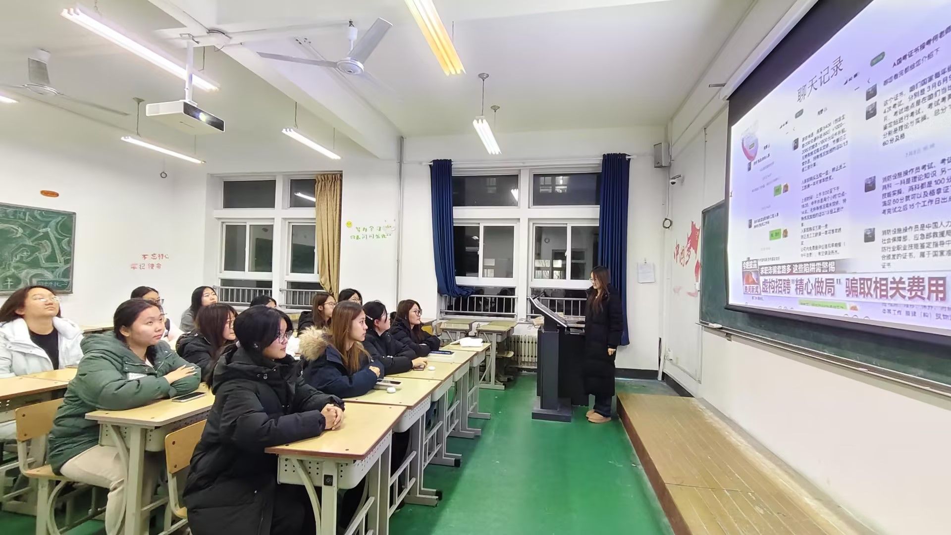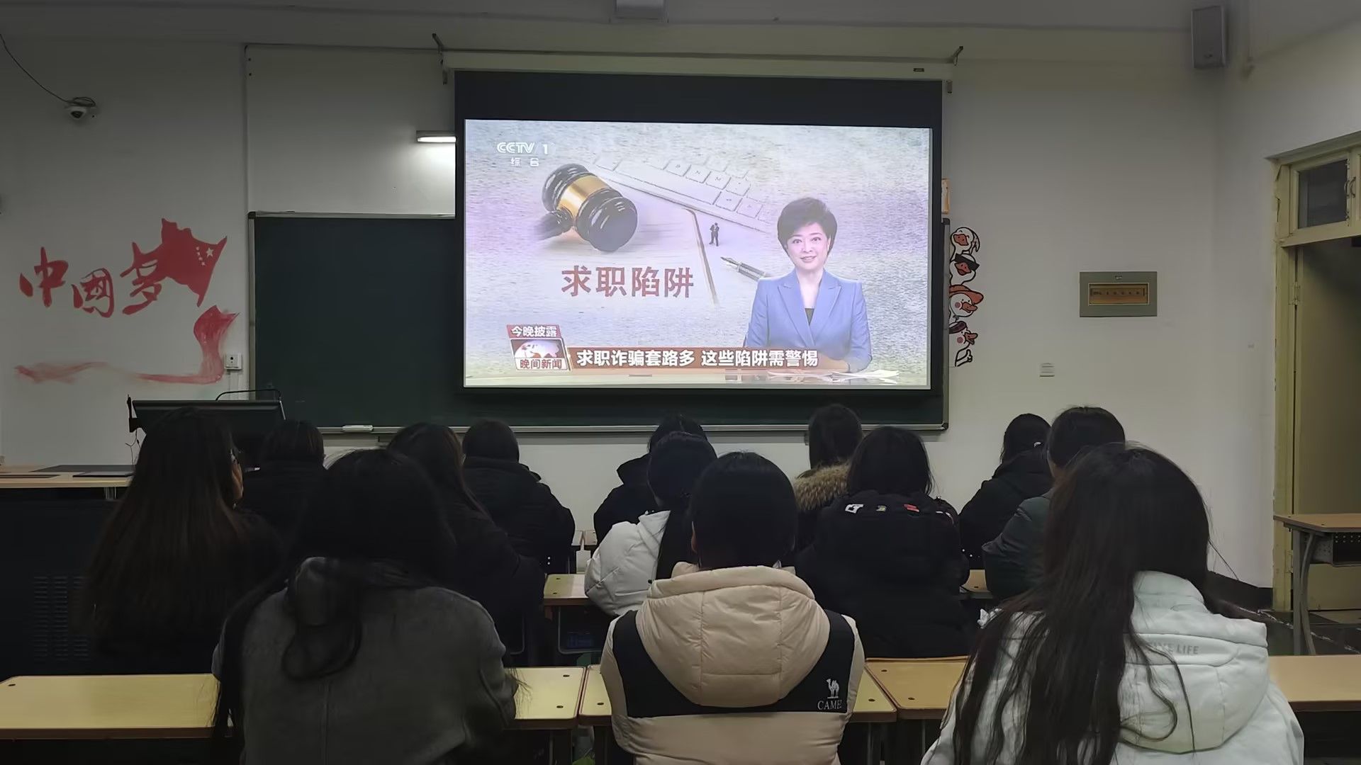 活动通过观看视频形式进行,一开始,视频中用一组数据揭示了求职诈骗的严峻性,让在场同学深刻认识到,就业防诈骗绝非“纸上谈兵”,而是关乎自身权益的“必修课”。随后,结合文化旅游学院各专业的就业特点,视频进行了针对性的诈骗陷阱剖析与防范指导,手把手教学生掌握“查资质、核信息、拒预付、签合同”的四步防骗法。互动环节中,同学们纷纷发表感悟。24级应用英语三班的韩千惠在参与后深有感触地说到,“此次活动让我意识到,看似光鲜的‘海外公司’‘高端岗位’背后可能隐藏着重重陷阱。未来求职,我一定会通过官方渠道反复核实企业信息,绝不轻信口头承诺,也不会轻易向陌生机构转账缴费。”25级应用英语二班的李瑞格意识到,“求职不仅要积极,更要保持警惕,那些‘高薪低门槛’的机会,往往是最大的陷阱。”大家纷纷表示,等活动结束会把这些防骗知识分享给室友。
