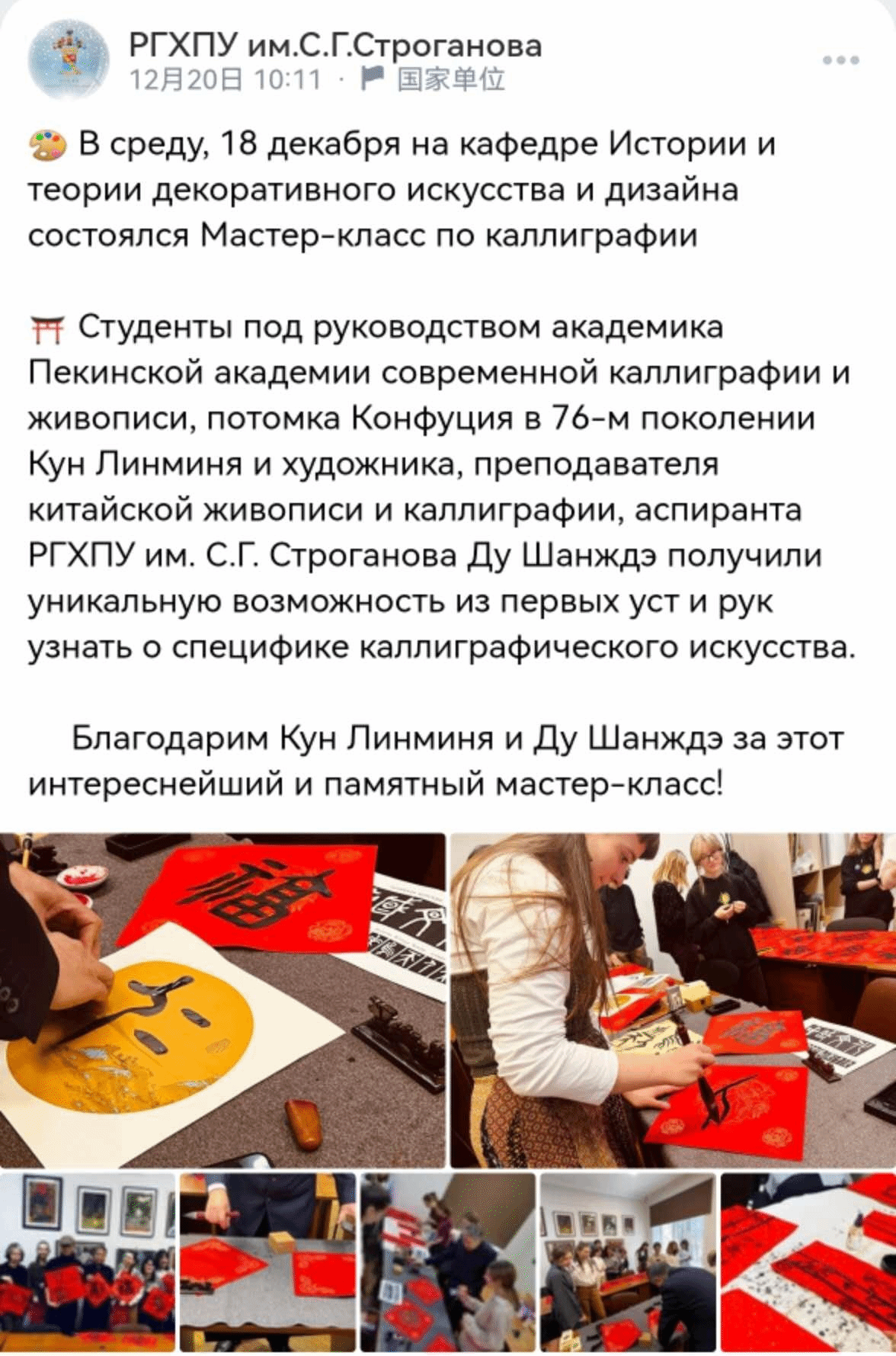 谈及自己在俄罗斯期间的经历,杜尚劼表示:“作为一名高校教师党员,我始终牢记教书育人与文化传播的双重使命。在异国他乡用艺术搭建中俄友谊的桥梁,让更多俄罗斯朋友了解中国书画之美,同时也为中国石油海外员工送去精神食粮,我感到无比荣幸。这些实践不仅丰富了我的人生阅历,更让我深刻体会到,文化交流需要脚踏实地的行动。未来,我将把在俄罗斯积累的经验带回学校,融入课堂教学,培养更多具有国际视野和文化自信的青年人才,为职业教育高质量发展和中外人文交流贡献自己的一份力量。”